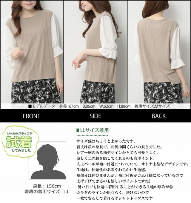 大きいサイズ レディース カットソー キャンディースリーブ メール便対応 5分袖 パール 異素材切替 トップス M/LL/3L/4L/5L ゆったりサイズ ぽっちゃり女子 プラスサイズ