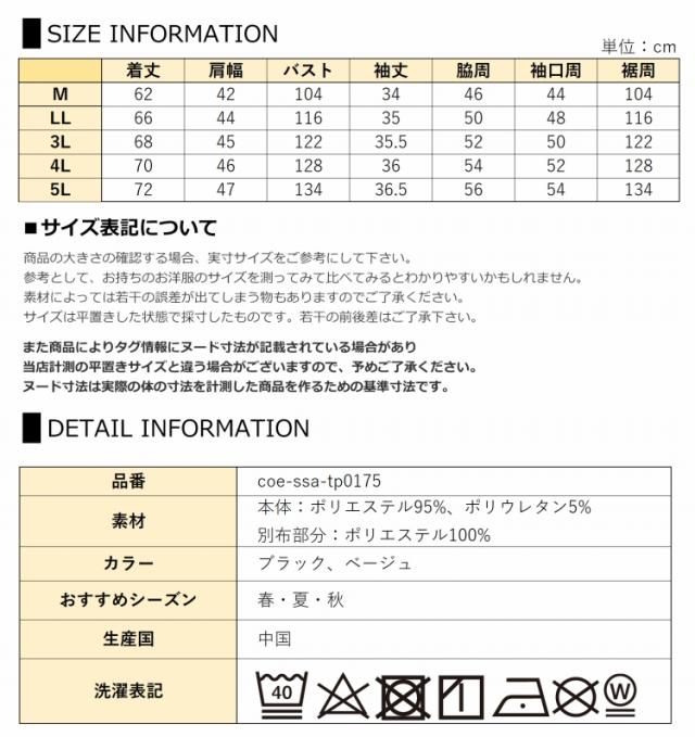 5L:着丈72 肩幅47 バスト134 袖丈36.5 脇周56 袖口周54 裾周134