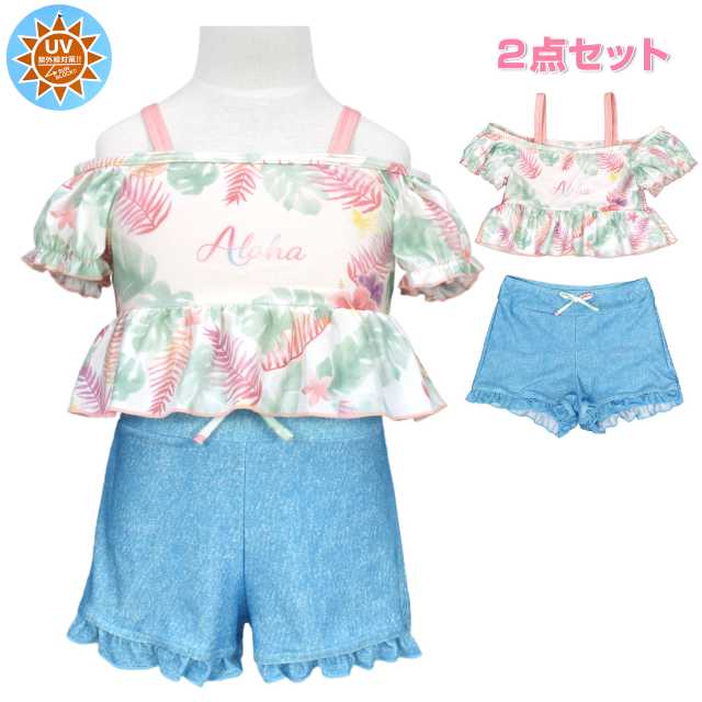 優しいカラーのボタニカル柄が 可愛い スイムウエア です。トップス オフショルダー と裾のフリルが可愛いデザイン。ボトムス イナーショーツ が一体型となったショートパンツ。UVカット加工で紫外線対策もバッチリ。