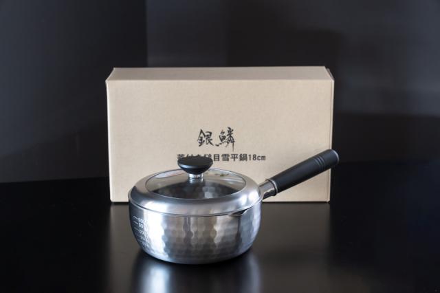 槌目雪平鍋 18cm 蓋付き 銀鱗 ステンレス製 日本製 ( 燕三条 Made in TSUBAME ガス火対応 雪平鍋 行平鍋 片手鍋 ガラス蓋付き 18センチ 注ぎ口付き ゆきひら鍋 なべ お鍋 ステンレス製雪平鍋 注ぎ口あり 両口鍋 槌目 調理器具 )
