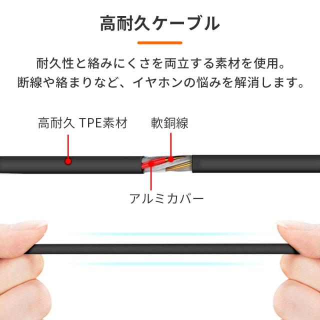 耐久性と絡みにくさを両立する、頑丈な素材を使用。断線防止 や絡まりを防ぐなど、有線 イヤホン 特有の悩みを解消しました。