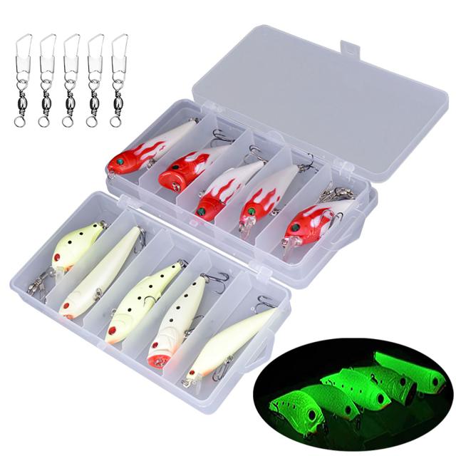 -- ルミナス ルアー セット: ナイト フィッシング ルアー セットには、VIB 1 個、ポッパー 1 個、クランク 1 個、ミノー 1 個、ペンシル ルアー 1 個、グロー イン ザ ダークが含まれます。完璧な組み合わせにより、より多くの魚を捕まえ、より多くの楽しみを生み出すことができます。