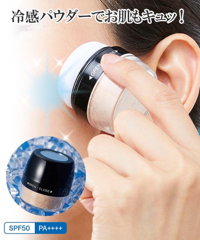 むれむれマスクでメイクもぐっしょり 冷感パウダーでお肌もキュッ! 開いたお肌もしっかりとカバー ヒンヤリ効果で涼肌キープ!