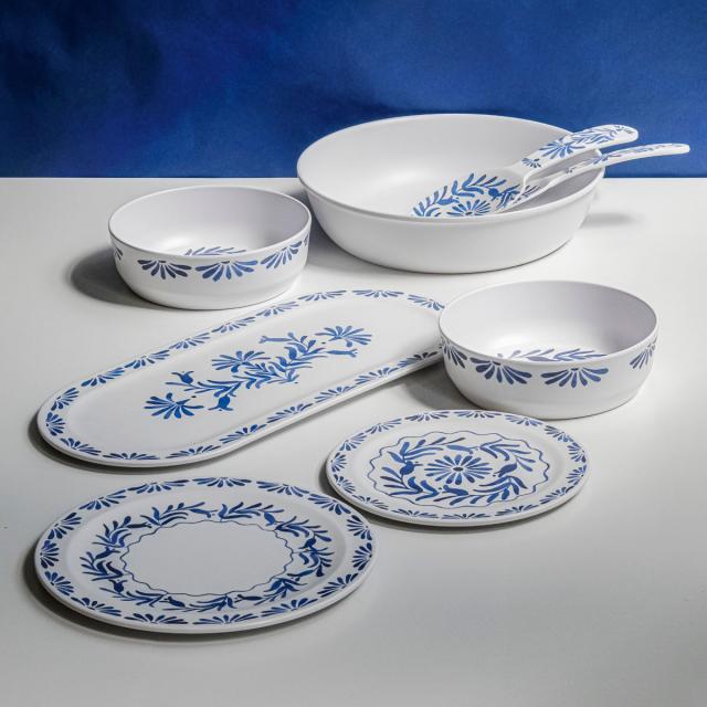 ホワイトベースにブルーのプラントデザインが特徴のメラミン食器
