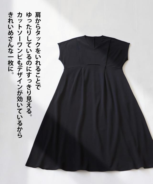 カットソーワンピにデザインが効いていて、高級感も漂うワンピの登場。