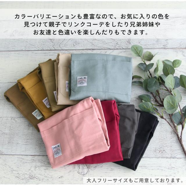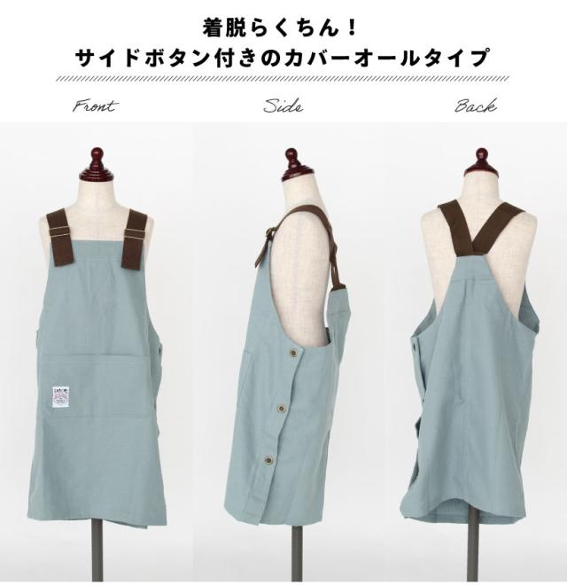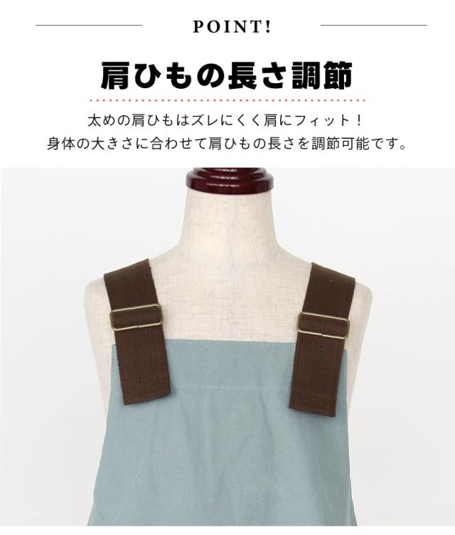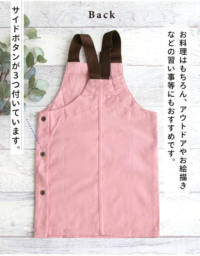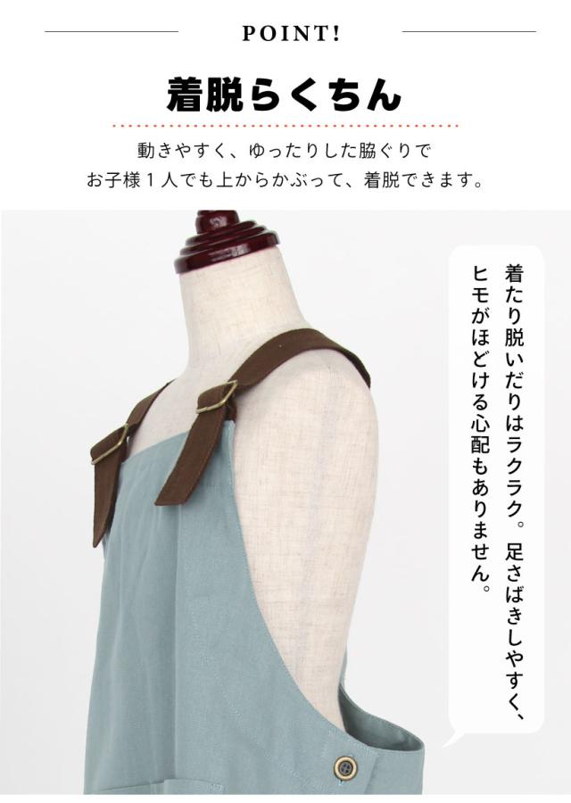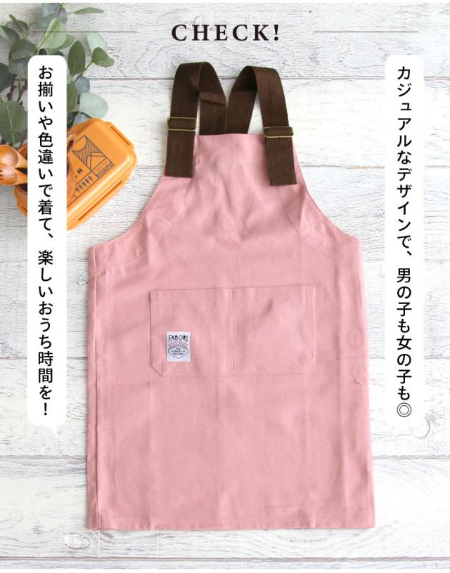 お子様一人でも着脱しやすいカバーオールタイプのキッズエプロンです。 かぶるだけでもOK、左サイドのボタンもすべて開閉可能で、着たり脱いだりはラクラク。 カジュアルなデザインで、男の子も女の子もOK! お料理はもちろん、アウトドアやお絵描きなどの習い事等にもおすすめです。 カラーバリエーションも豊富なので、お気に入りの色を見つけて兄弟やお友達と色違いを楽しんだり、大人サイズのご用意もありますので親子リンクコーデもおすすめです。
