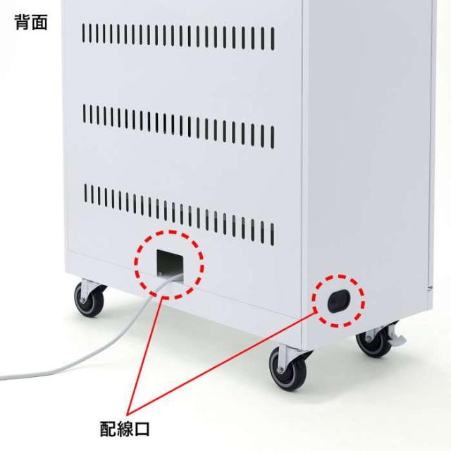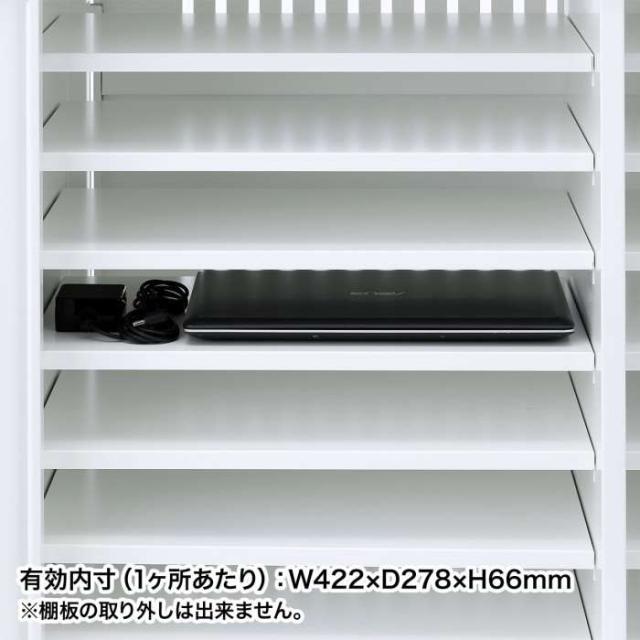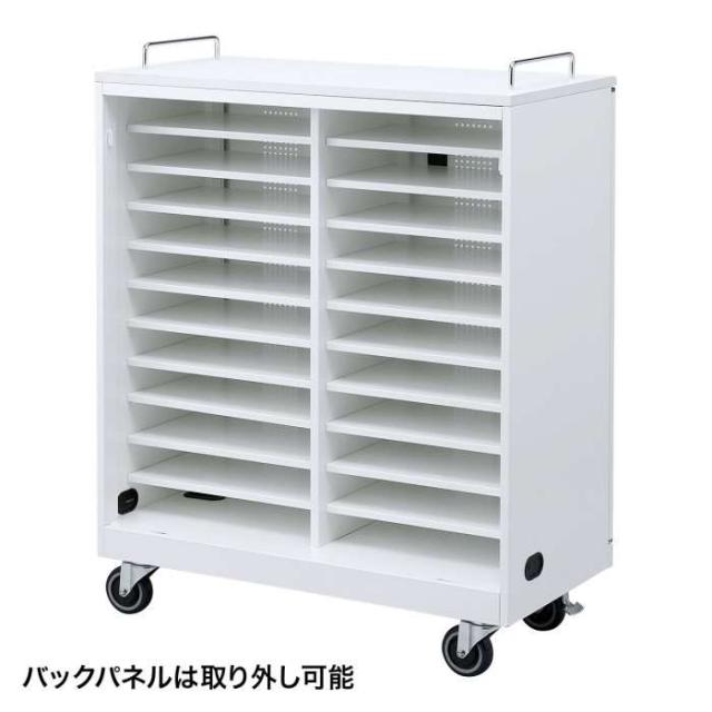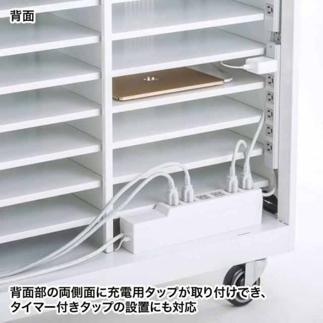 ●ノートパソコンを22台まで収納できます。有効内寸(1ヶ所あたり)はW422×D278×H66mmです。※棚板の取り外しはできません。●背面部の両側面部分にマグネット付きの6個口タップが4個装着できます。●バックパネルが外れ、配線処理がしやすくなっています。●大型キャスター(直径100mm)を採用することにより段差や溝のある場所でもスムーズに移動できます。●木製天板を採用することにより耐荷重をアップさせています。プリンターなどの周辺機器をのせても天板がへこむ心配がありません。※キャスターでの移動の際段差などを勢いよく越さないでください。製品自体の高さがあるため転倒する場合があります。また当製品は長い距離の移動を考慮して作られておりません。