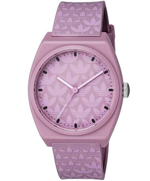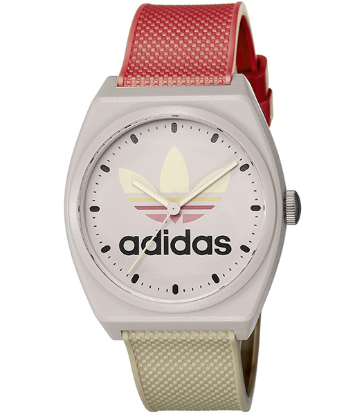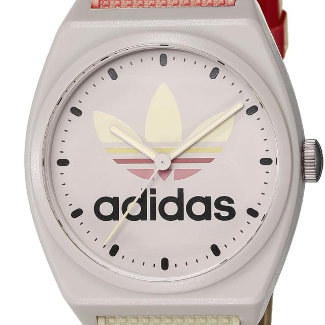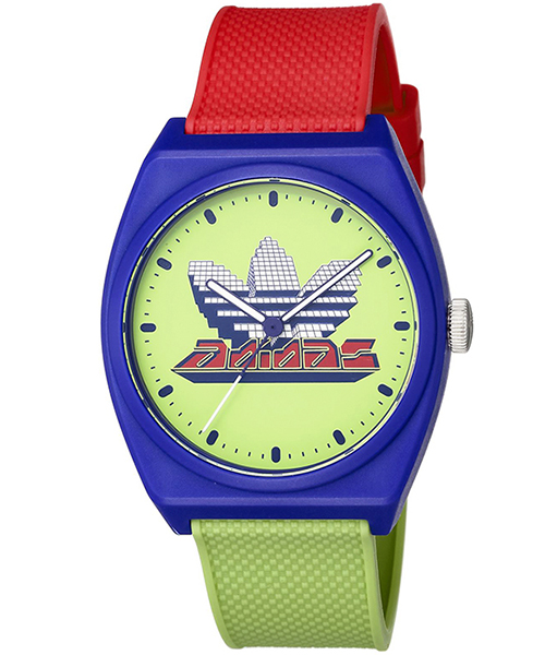 『adidas Originals(アディダス オリジナルズ)』を代表する、PROJECT TWOのグラフィックモデル。”トレフォイルロゴ”(三つ葉ロゴ)を大胆に取り入れた、スポーティー且つストリートなデザイン。腕になじみやすいラバーベルトと34gの軽量設計で、ストレスを感じさせない軽やかな着け心地を実現、アクティブに使用することが出来ます。2023SSは、ロゴを大胆に解釈したレトロなグラフィックや特徴的なカラーリングのストリート感あふれるモデルです。 レトロに解釈されたトレフォイルロゴを文字盤中央に大きく配し、遊び心の効いたカラーリングを施した、インパクトあるモデルです。腕元に存在感をプラスしてくれます。