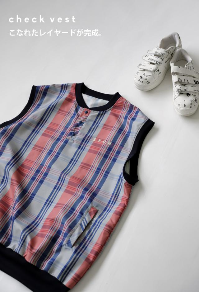 zst-00025 トップス ノースリーブ チェック柄 柄 プルオーバー ゆったり シンプル レイヤード 重ね着 セットアップ Vネック ポケット付き スポーティー ユニセックス オソロ
