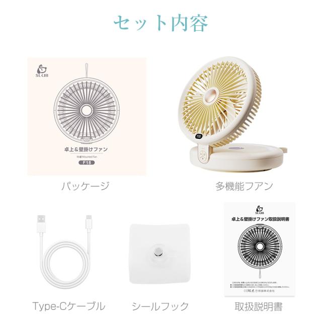 【パッケージ内容】ファン本体、Type-C充電ケーブル、シールフック、取扱説明書。