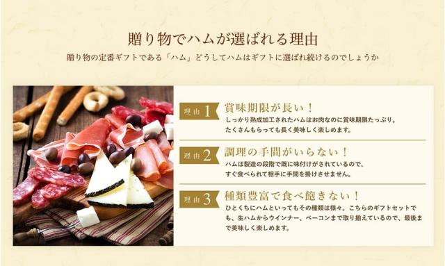 ・特撰ホワイト肩ロース(170g)×1個・直火焼焼豚(170g)×1個・あぶり焼ハーブローフ(170g)×1個・厚切りステーキ(110g)×1個・グリルローフ(110g)×1個・ペッパーボロニア(110g)×1個・特撰ポークウインナー(80g)×1個
