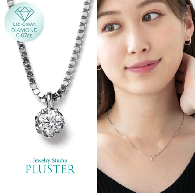 Jewelry Studio PLUSTER が使用する" ラボ グロウン ダイヤモンド "は、その起源が地球ではなくラボ=最新テクノロジーであるというだけで、天然ダイヤモンドと100%同じ同じ光学的、化学的、物理的特性を持っています。キュービックジルコニアなどの模造石とは全く異なる、ダイヤモンドの「本物の輝き」を楽しめるダイヤモンドネックレスです。