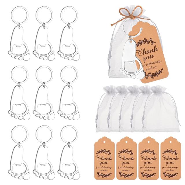 20 個足跡キーホルダーボトルオープナーセットとオーガンザバッグタグジュート麻ひもベビーシャワーの好意ゲスト