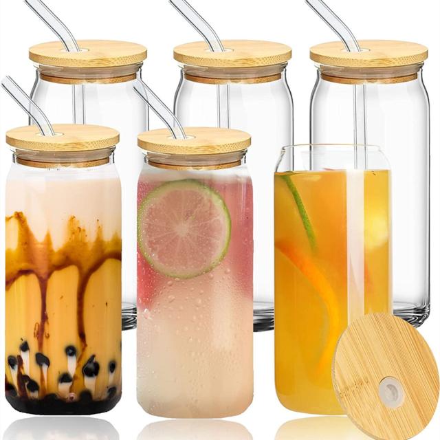 4 個 500 ミリリットル 16 オンスクリア飲料グラス竹蓋ガラスストローブラシ再利用可能なビール缶ガラス