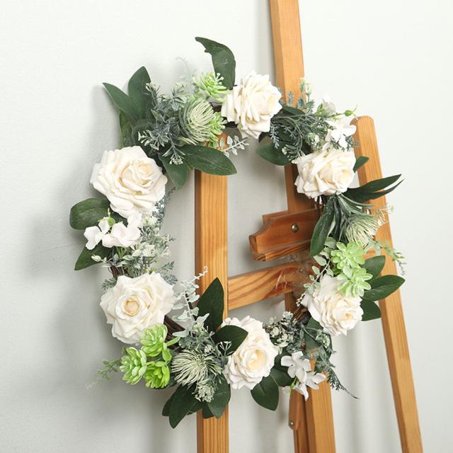 --ローズ リース: 白いバラはロマンスのシンボルで、新鮮な葉と調和し、花はよりリアルでリアルに見えます。シミュレートされた多肉植物が添えられているので、リースはフルで高品質に見えます。
