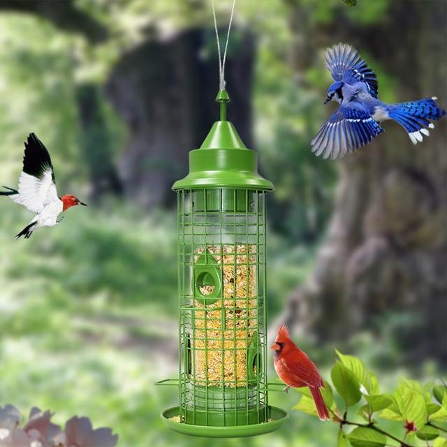 -- この鳥の餌場は、リスを寄せ付けないように鉄の網で囲まれ、4 つの餌場が固定されています。