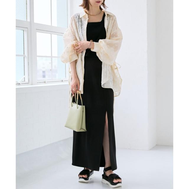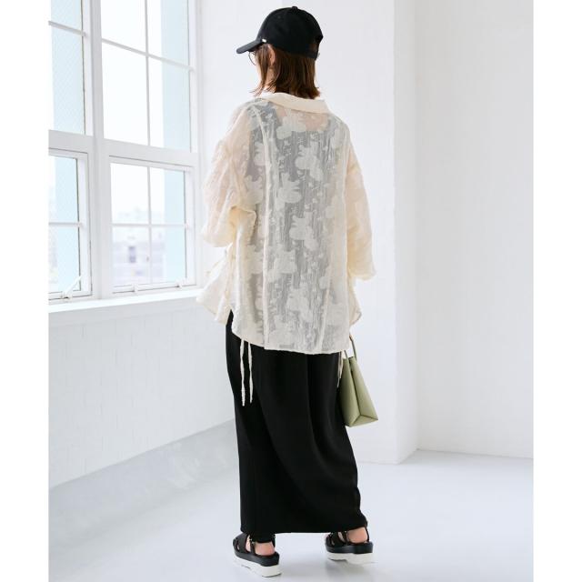 Iラインシルエットを活かしてトップスはボリュームのあるブラウスを合わせるスタイリングや