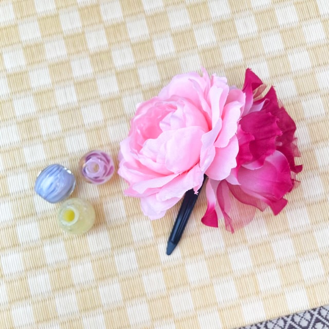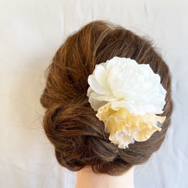 2つの花がモチーフとなっております。2つの花はカラーが少しずつ違うので着ている柄の色味に合わせやすいです。ボリュームが出るのでヘアスタイルのアクセントとなってくれます。クリップタイプで装着が簡単です。