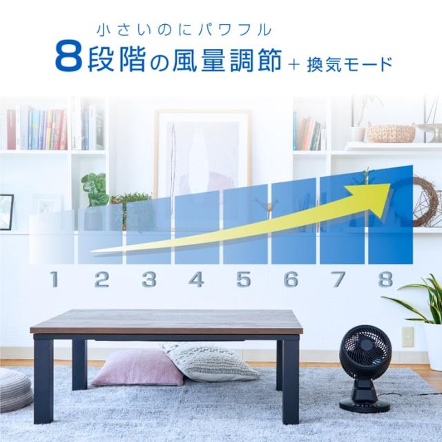 風量は微風〜強風の8段階プラス換気モードの9段階に設定でき、室内の空気を緩やかに循環させて冷暖房の効率をアップしたり、