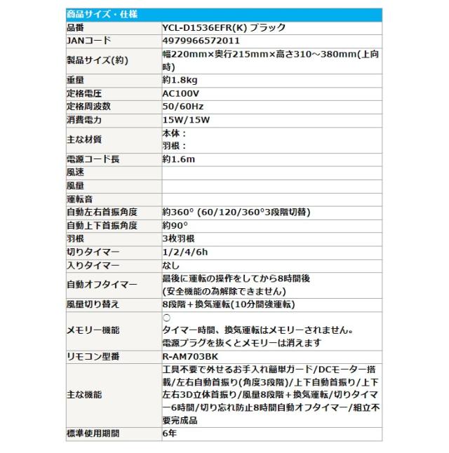 | サーキュレーター DCモーター 3枚羽根 20畳 3D首振りリモコン付き YCL-D1536EFR K ブラック スペック情報 | |