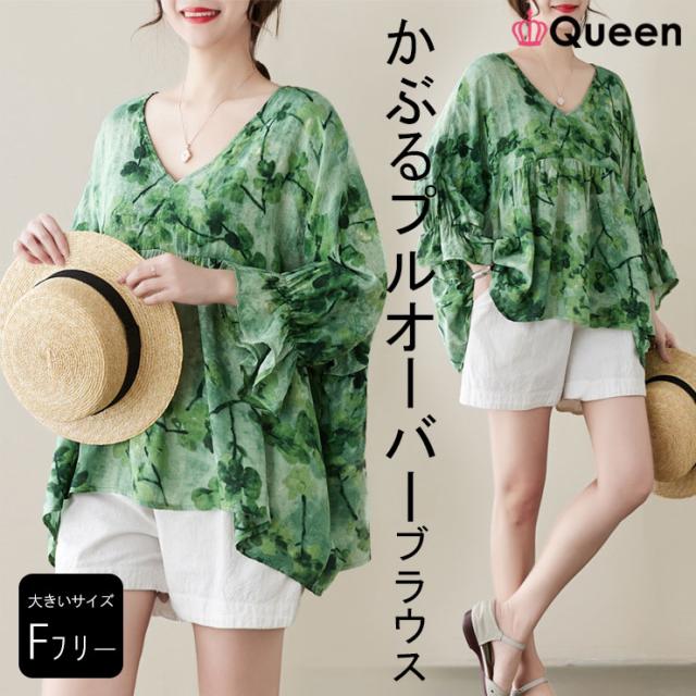 ★☆大きいサイズレディース チュニックブラウス 七分袖 オーバーサイズ 花柄トップス 体型カバー 夏 LL 3L 4L 5L 6L グリーン 新入荷 メール便可☆★