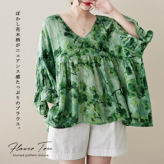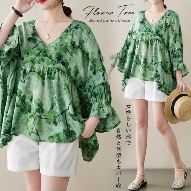 大きいサイズの服 夏らしい花木ニュアンス柄のワイドブラウス
