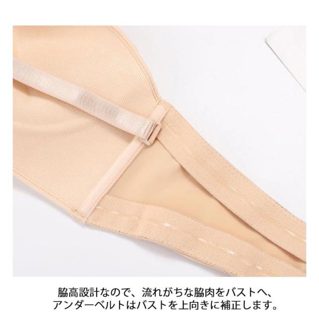 | 肩や胸元のあいたドレスに絶対おすすめ! ストラップレスなのでフロントホックで美乳をメイク。 ノンワイヤーで優しい着け心地♪立体カップで綺麗なシルエットに。 フロントホックでで肩紐がなくても下がってこない。 脇高設計なので、流れがちな脇肉をバストへ、アンダーベルトはバストを上向きに補正します。 ドレススタイルの他、オフショルや夏のファッションにも大活躍間違いなし! | |