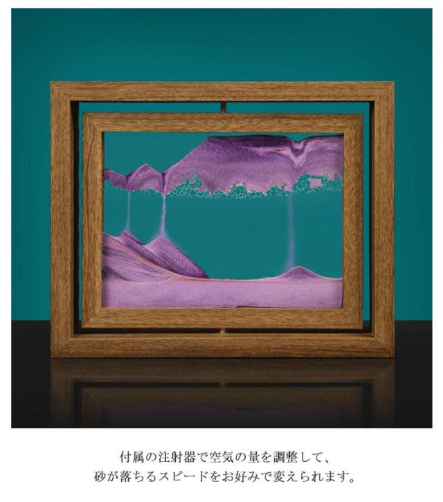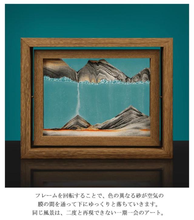 | 高級木材を使用し回転できるフレームで上品に仕上げたサンドピクチャー。 どんなインテリアにも合うナチュラルなデザイン、モノトーンの砂がお部屋にモダンな雰囲気を演出してくれる砂のアート。 水・空気・砂が自由に動き回ることで、さまざまな風景を作り、プレッシャーを解放し、想像力を育むことができます。 フリップするたびに、砂はゆっくりと底に落ち始め、山、砂漠、海、そしてあなたがそれについて考えるものは何でも形成します。 透過率の高い鉛フリーガラスを使用し、画像の質感を2倍にして、流砂の美しさを存分に楽しんでください。 フレームを回転することで、色の異なる砂が空気の膜の間を通って下にゆっくりと落ちていきます。同じ風景は、二度と再現できない一期一会のアート。 付属の注射器で空気の量を調整して、砂が落ちるスピードをお好みで変えられます。 見ているだけでリラックスできる癒しグッズはお友達やご家族へのプレゼントにも最適です。 | |