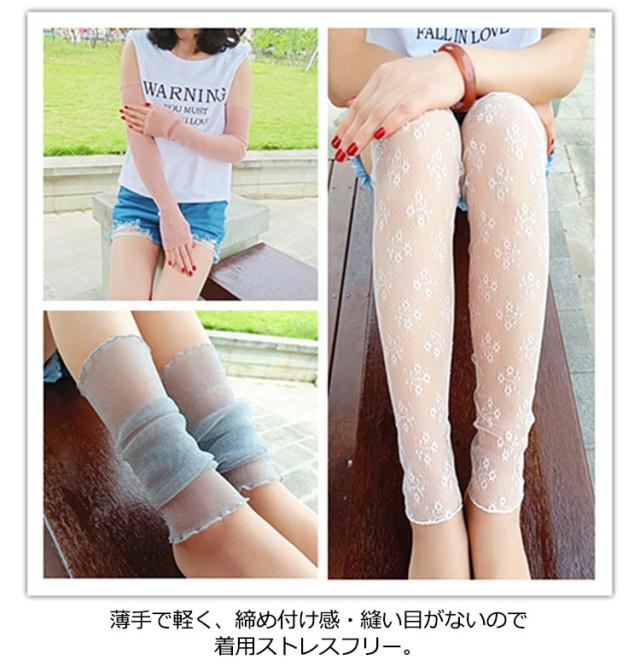 | ミニ丈のスカートやパンツなど着用時にさみしい足元を上品にカバーしてくれるレースレッグカバー。 抜群の肌触りで、優しく腕や足を包み込みます。 薄手で軽く、締め付け感・縫い目がないので着用ストレスフリー。 伸縮性にすぐれており良く伸びるため、 アームカバーとしてもご使用いただけます。 紫外線や冷房の冷え対策として、屋外でも室内でも便利に使える必須アイテム。 かわいらしいデザインなので、ファッションアイテムとしても注目される一品です。 | |