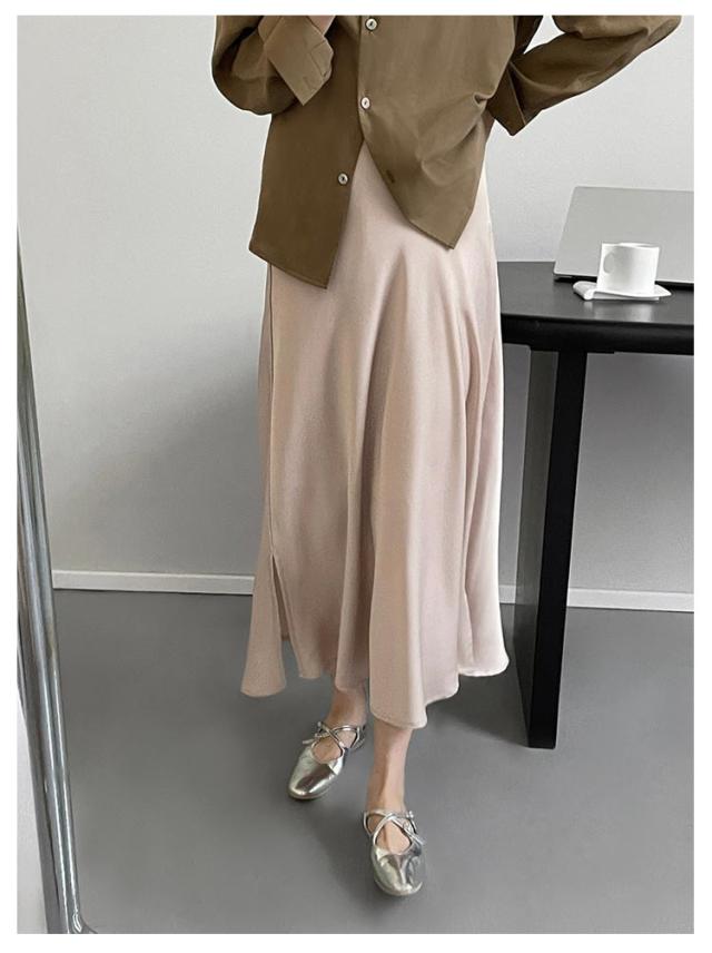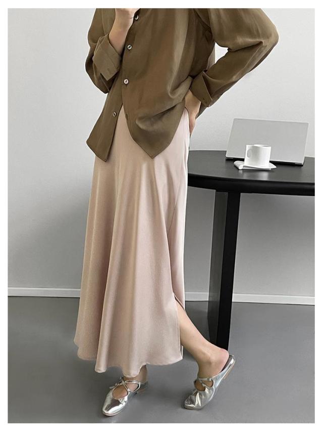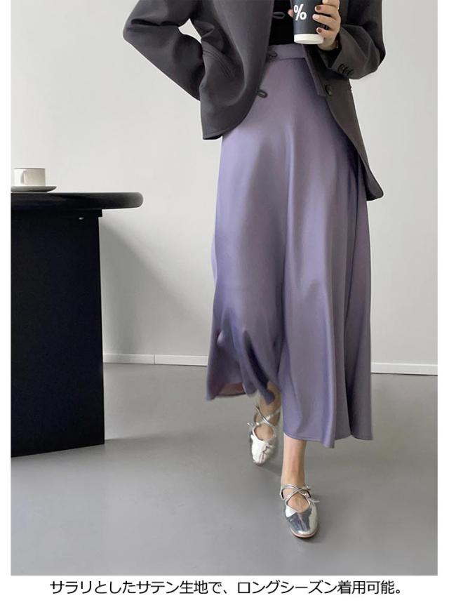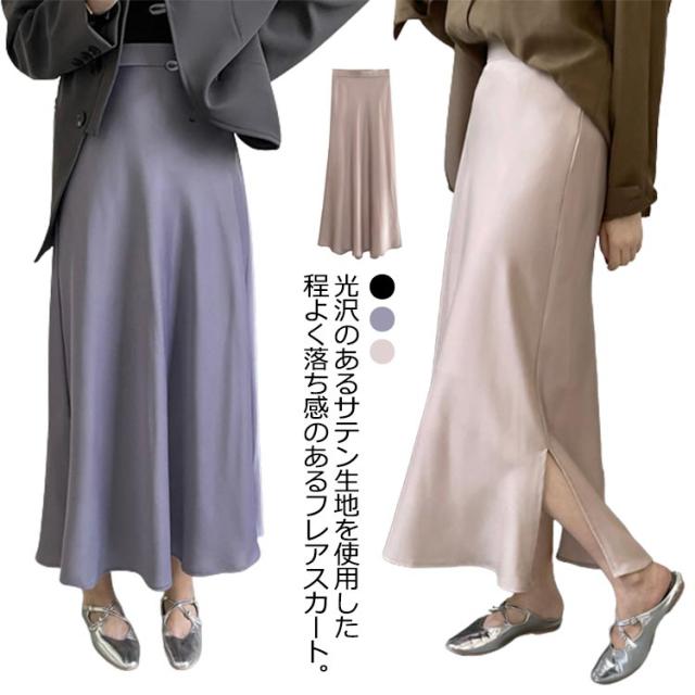 きれいめ サイドスリット フレアスカート マキシ丈 スカート 落ち感 とろみ レディース サテン 光沢感 上品 大人 フェミニン エレガント 通勤 オフィス 体型カバー 冷感 上品 韓国風 ロングスカート 20代 30代 40代 50代 涼感