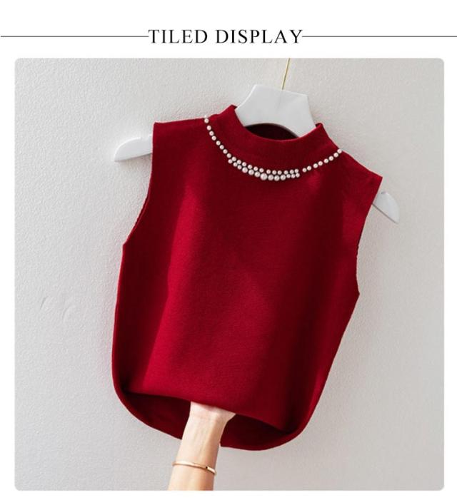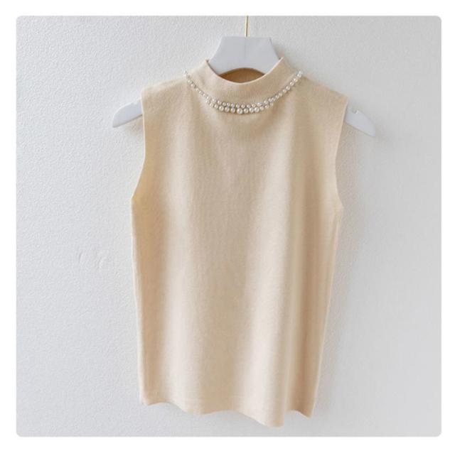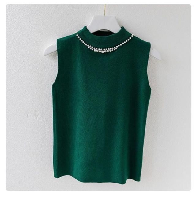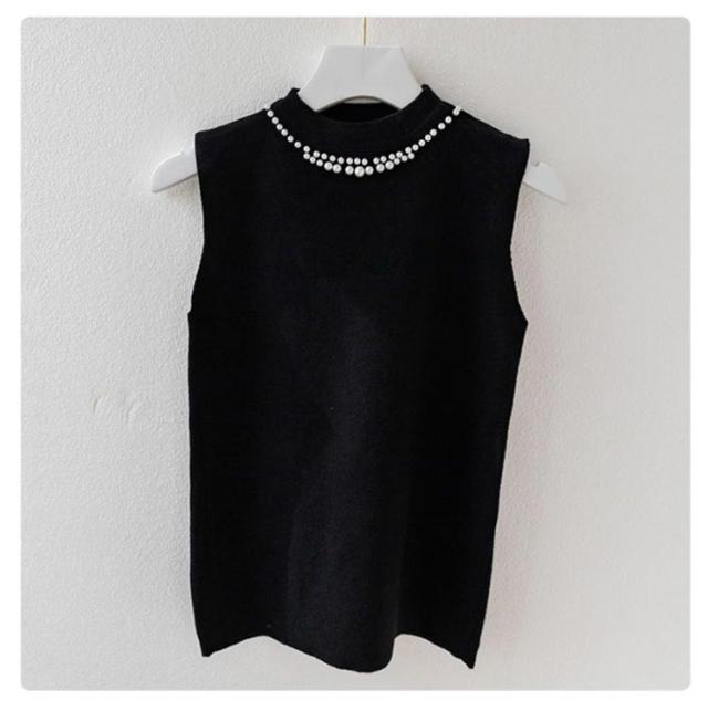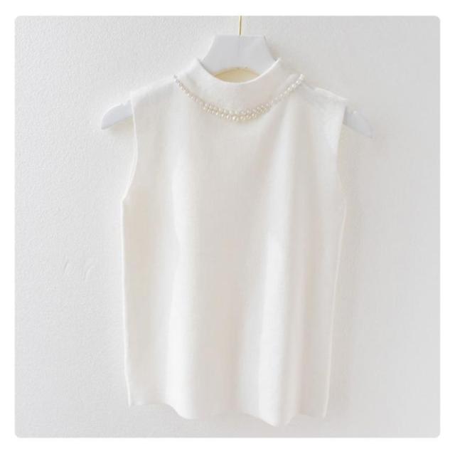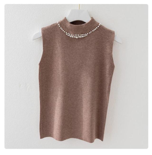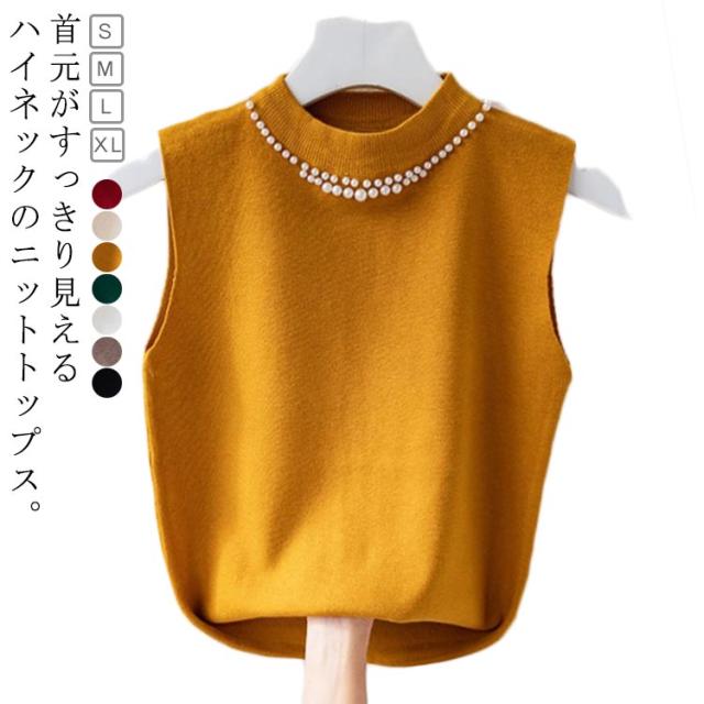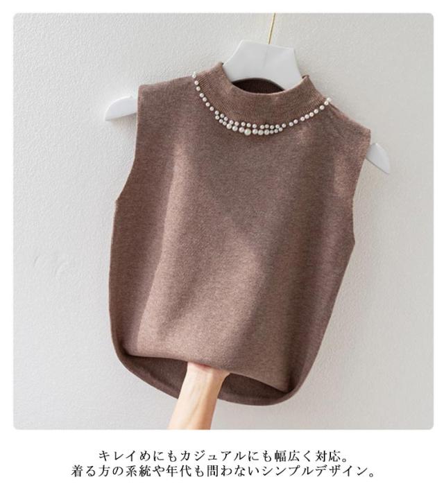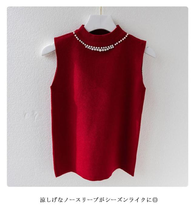 ノースリーブ 40代 トップス パール付き ニットベスト スリム ニットタンクトップ リブニット タートルネック 無地 フィット ハイネック 夏 秋 春 ニットトップス フェミニン きれいめ 大人 通勤 20代 30代 サマーニット