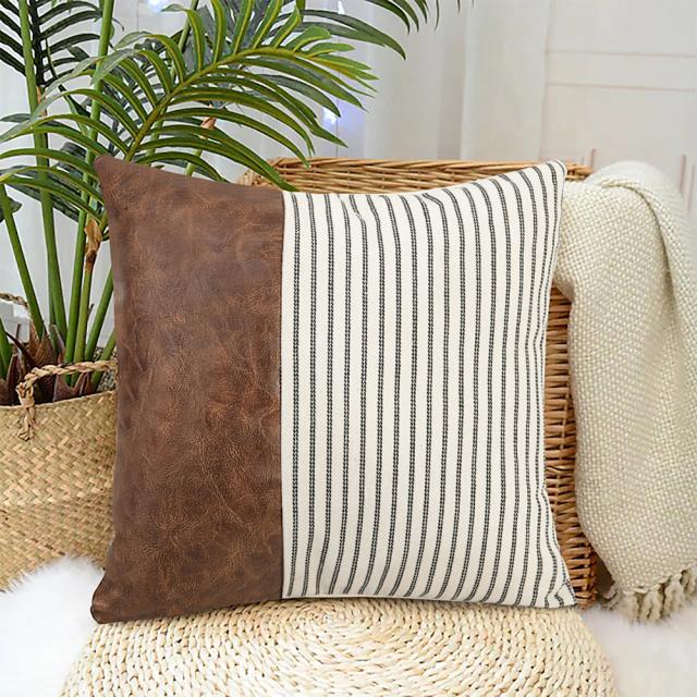 ホームストライプパッチワークスローピローカバーモダンな装飾フェイクレザーピローケースソファカウチ用