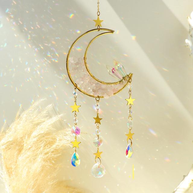 --アメジスト装飾: 吊り下げムーンサンキャッチャーにセットされた天然の磨かれたアメジストがいくつかあります。