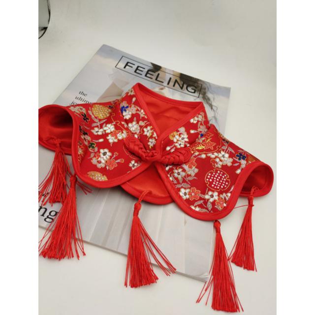 雰囲気を加える:この襟は赤い色がメインで、模様があり、小さな赤いお祭りのペンダントがあり、春節の雰囲気がいっぱいです。
