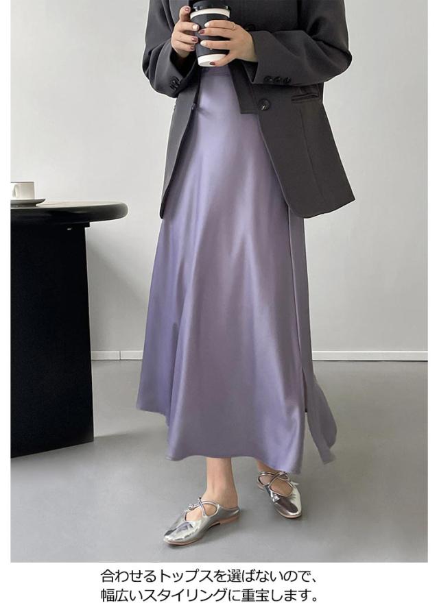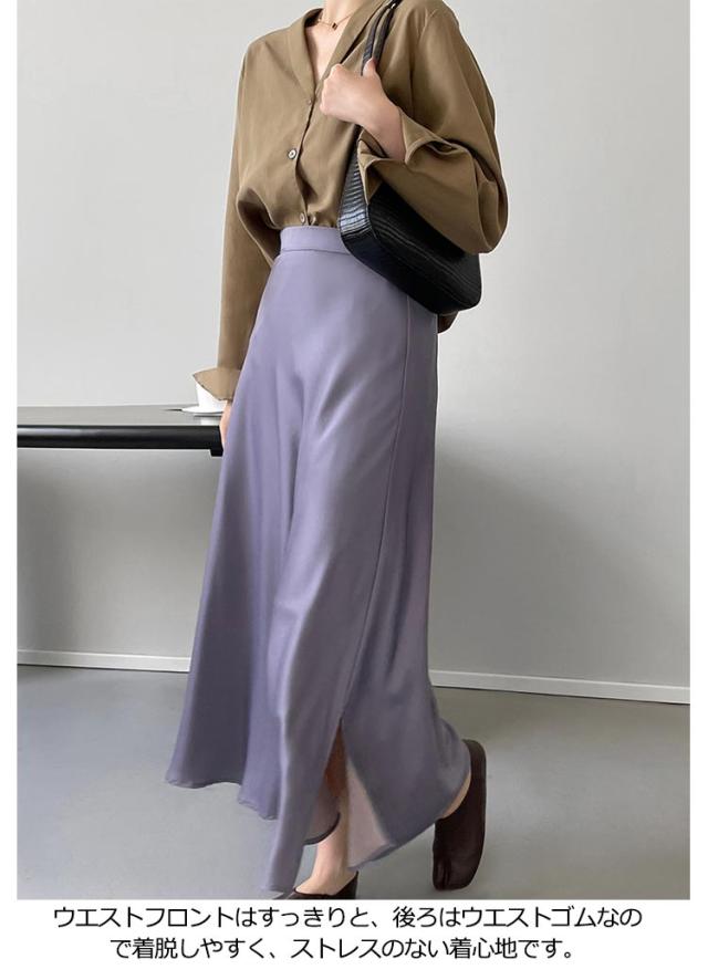スカート サテン フレアスカート サイドスリット レディース ロングスカート マキシ丈 落ち感 とろみ 光沢感 上品 大人 フェミニン エレガント 通勤 オフィス 体型カバー 冷感 涼感 韓国風 きれいめ 20代 30代 40代 50代 無地 おしゃれ