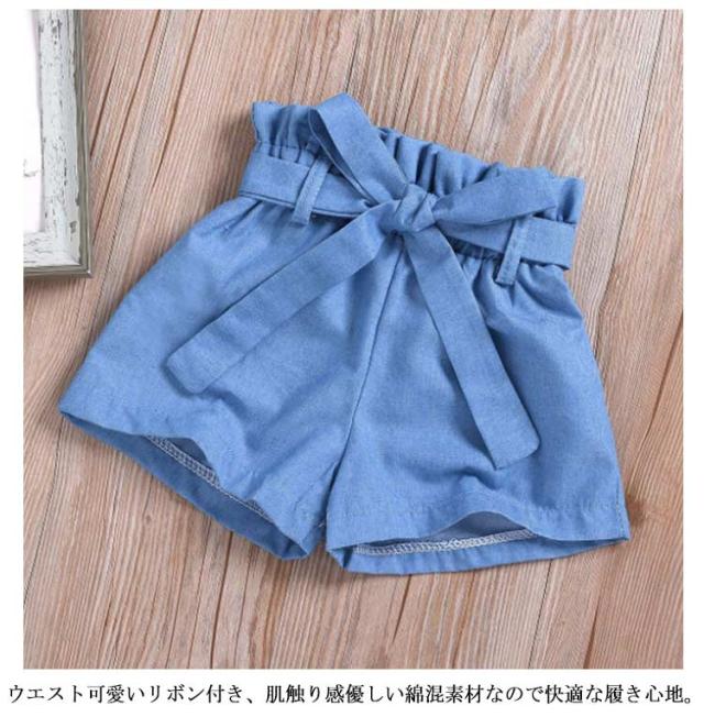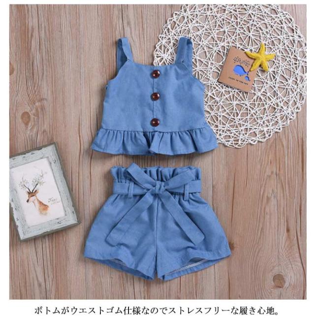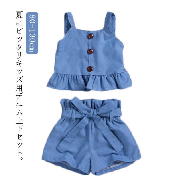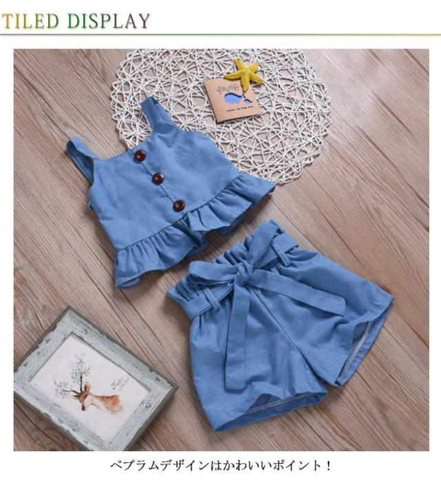 デニム セットアップ キッズ 女の子 2点セット ジーンズ ペプラム 上下セット ワイドパンツ ハーフパンツ ノースリーブ キャミソール タンクトップ デニム半ズボン ゆったり こども 可愛い きれいめ ウェストリボン 80cm 90cm 100cm 110cm 120cm 130cm
