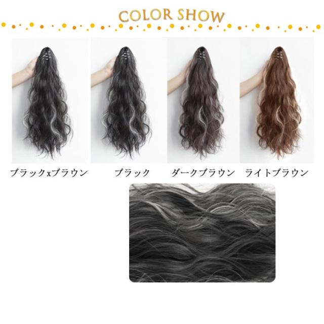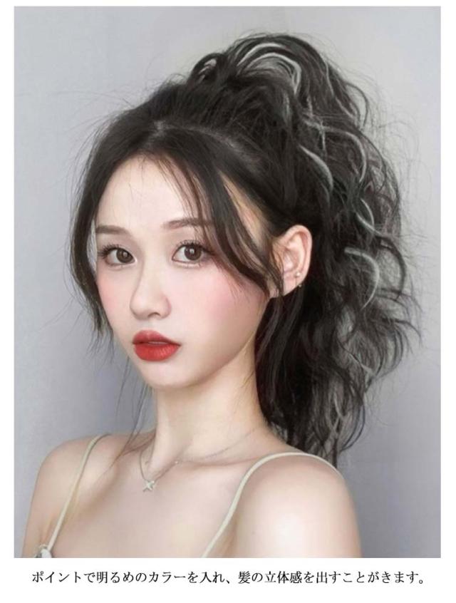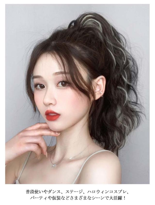 | ハイライトカラーを入れたカールのポニーテールウィッグ。 ポイントで明るめのカラーを入れ、髪の立体感を出すことがきます。 クリップで留めて固定するだけで簡単に着けることができます。 普段使いやダンス、ステージ、ハロウィンコスプレ、パーティや仮装などさまざまなシーンで大活躍! | |