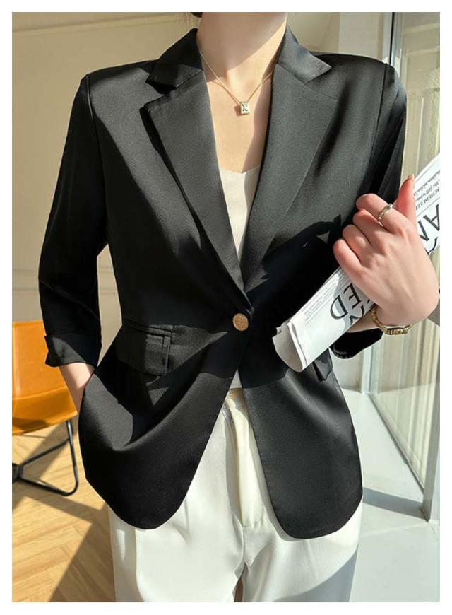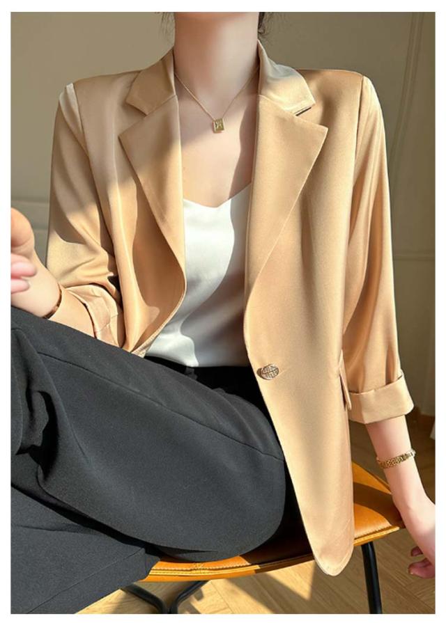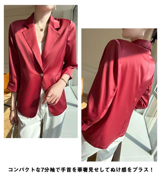 | 【商品名】テーラードジャケット 【サイズ】サイズ表 【素材】アセテート繊維 その他 【特徴】レディース薄手テーラードジャケットが新入荷。 光沢で上質感があり、快適な薄手生地を使用。 1枚もっていると通勤やフォーマルな場面でも活躍するオケージョン必須アイテムです。 コンパクトな7分袖で手首を華奢見せしてぬけ感をプラス! ライトアウターとしてこれからの時季にぴったりなアイテムです! | |