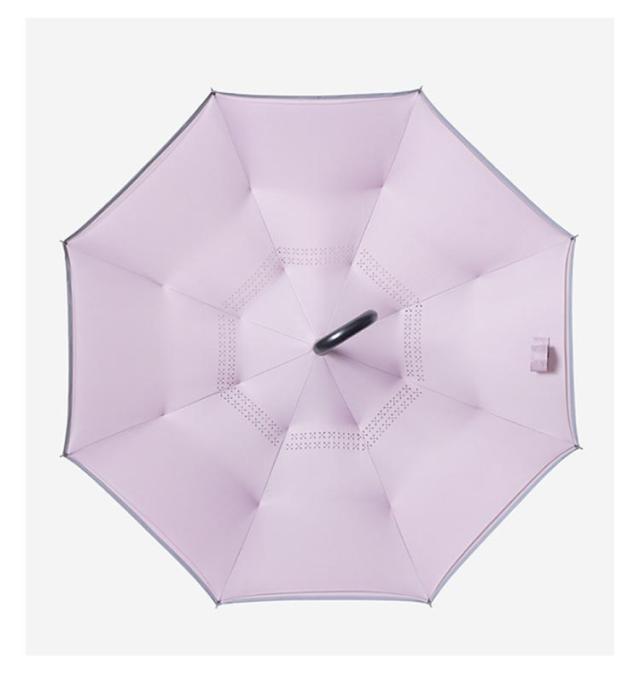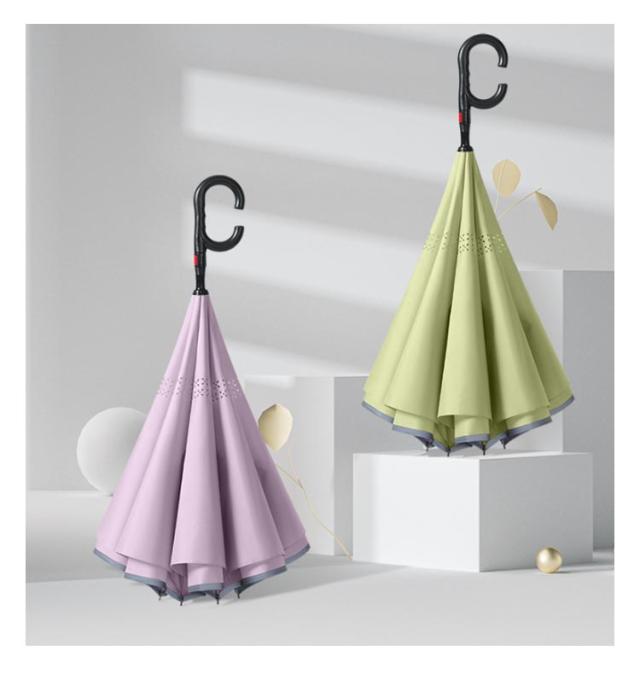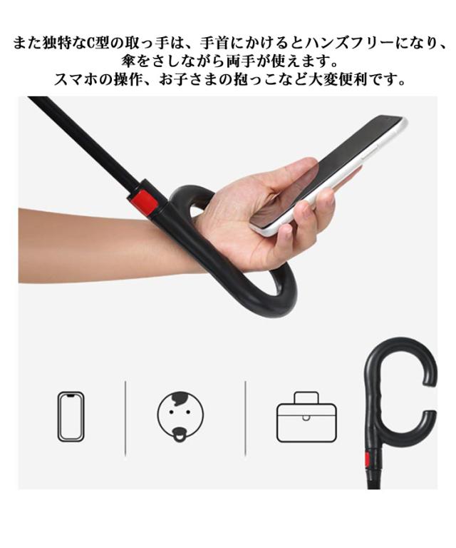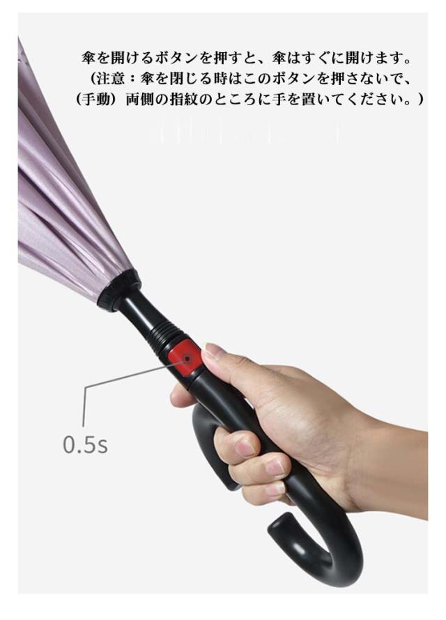 | 乗車降車なども雨にほとんど濡れること無くスムーズに! 逆さまに開いて逆さまに閉じる、新発想の傘です。閉じた時に、雨に濡れた面が内側になるので、周囲や人を濡らしません。 丁寧で丈夫な仕上げの2重生地は、しずくが柄に垂れるのを防ぎ、また独特なC型の取っ手は、手首にかけるとハンズフリーになり、傘をさしながら両手が使えます。 スマホの操作、お子さまの抱っこなど大変便利です。 水滴が落ちる、切れる!超撥水性だからびしょ濡れ感OFF! 雨の滴り方を見ても一目瞭然!撥水傘布を使用、テフロン加工を施しており、撥水性・防汚性が抜群! しっかりと自立するから、ちょっと両手を使いたい時や傘の置き場がないときなど、とても便利! 柔軟な素材のグラスファイバーを使った、特別設計の骨で風に強い。 傘を開けるボタンを押すと、傘はすぐに開けます。(注意:傘を閉じる時はこのボタンを押さないで、(手動)両側の指紋のところに手を置いてください。) 反射テープ付き、夜道でも安全。後方から近づく車のライトに反射して自分の位置を知らせるので、日暮れ時と夜道の交通安全に役に立ちます。 オシャレデザインで、 ビジネス用にも、プレゼントにもOK! | |