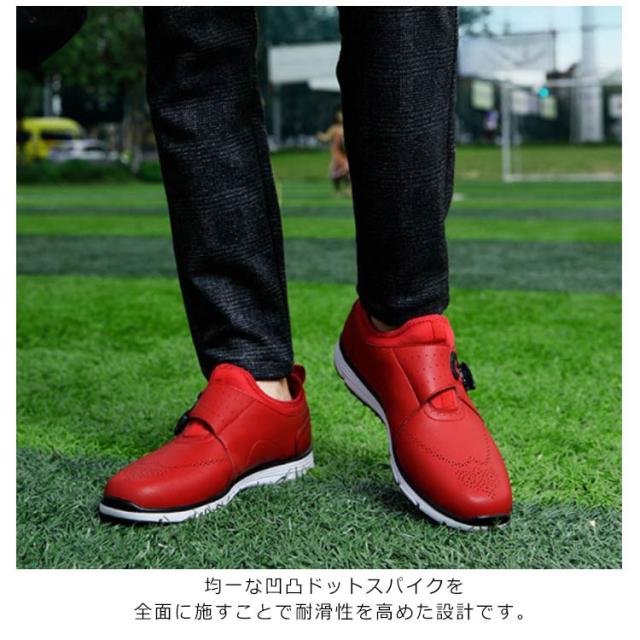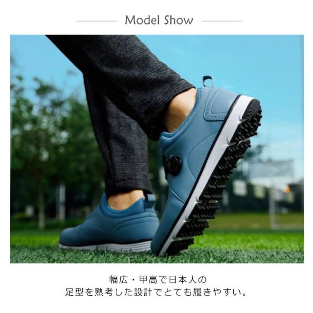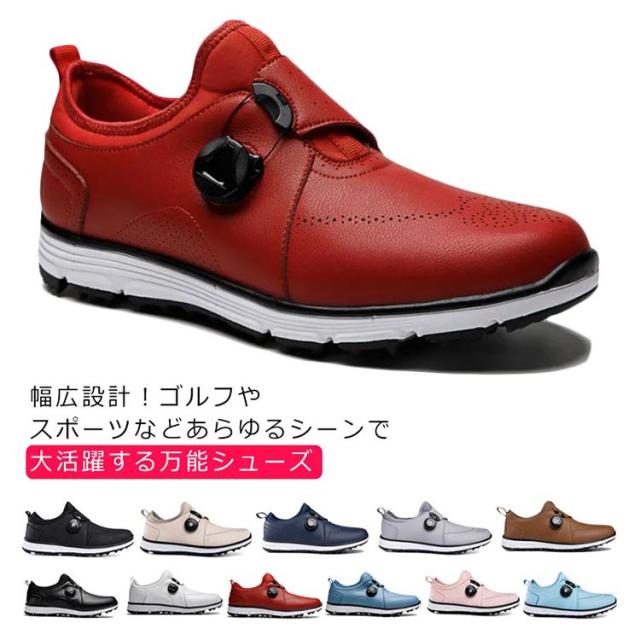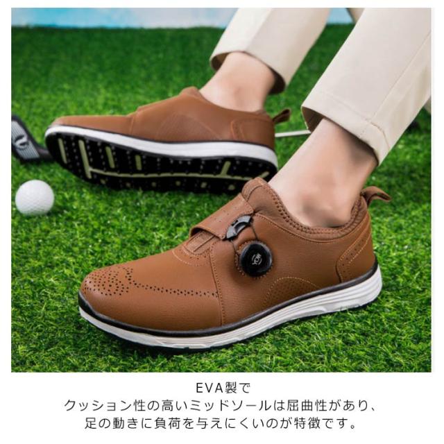 | 幅広設計!ゴルフやスポーツなどあらゆるシーンで大活躍する万能シューズ 幅広・甲高で日本人の足型を熟考した設計でとても履きやすい。 紐いらずの簡単操作、履きやすいダイヤル式! 内生地ライニングがメッシュで通気性が高く足あたりもなめらか。 EVA製でクッション性の高いミッドソールは屈曲性があり、足の動きに負荷を与えにくいのが特徴です。 アウトソール靴底はゴム製でしっかりしているので、地面への足つきも良く安定して歩きやすい。 均一な凹凸ドットスパイクを全面に施すことで耐滑性を高めた設計です。 撥水性に優れたPUレザー(合成皮革)でお手入れも簡単。 普段着用しているスニーカー感覚で着用いただいけます | |