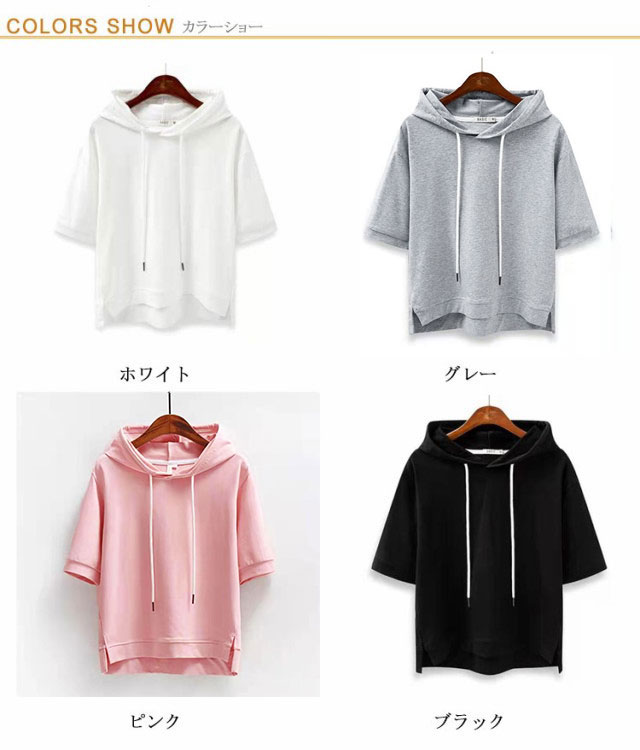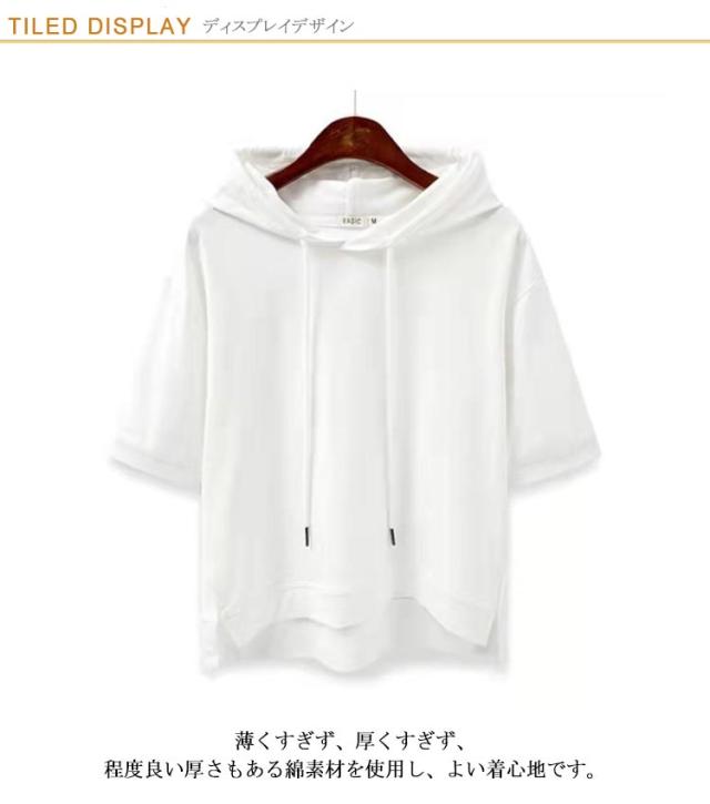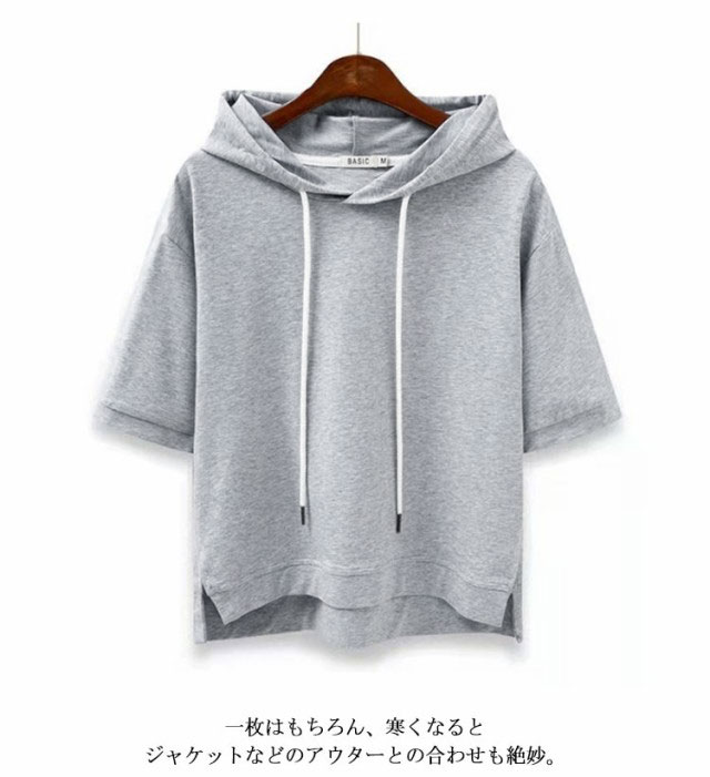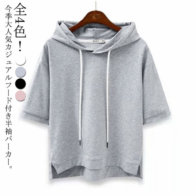 tシャツ パーカー レディース フード付き 半袖パーカー 送料無料 5分袖パーカー プルオーバー 薄手 夏用 トップス フード付きtシャツ スリット 学生 中学生 20代30代