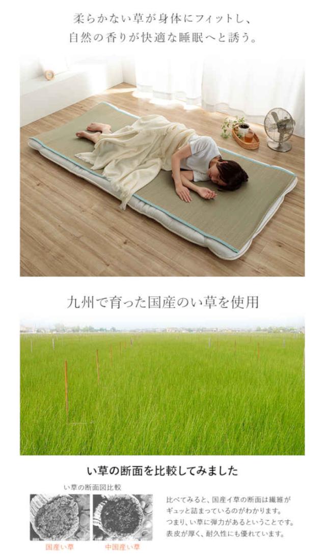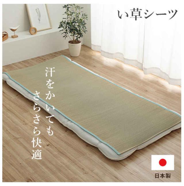 国産(九州産)のい草を使用した敷きパッドです。一本一本が太く、表皮が厚く繊維がキメ細かいので弾力性があり、耐久性に優れています。また、無染土のい草を使用しておりますので柔らかく、すべすべとして身体にフィットします。い草シーツは汗を吸収してサラリと過ごせる快眠シーツです。通常、い草は草の青さを保ったり、日焼けをしにくくする為に「染土」といわれる泥でい草を染める作業を行います。その作業をしない無染土い草を使用した商品です。泥染め加工を行ったい草とは違い、素材そのままのい草ですから、粉っぽさもなく、ほこりがたちにくく、肌触りが良いので快適な睡眠をサポートします。四隅にゴムバンドが付いており、ずれにくくなっています。快眠い草の効能として 1.綿の約2.5倍の吸湿力。2.蒸れにくい。汗による湿気を吸うことにより温度を下げ快適な就寝を促す。3.汗のにおいを軽減。汗のにおいの元となる化学物質を90%以上抑える。などがあります。暑苦しい日本の夏でも汗のジメジメを軽減してくれます。