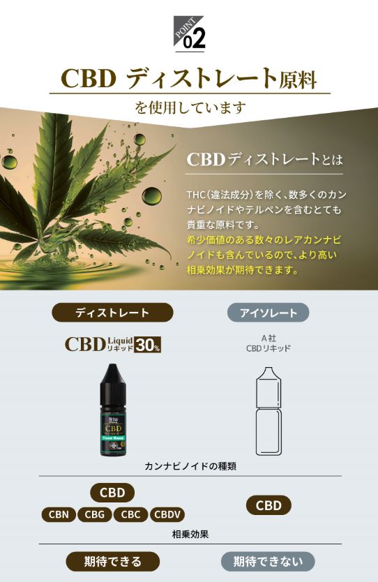 | 特徴 | ・摂取効率が良く、効き目の体感も早いのが特徴です。 ・休憩しながら手軽にCBDを摂取出来ます。 ・ノンニコチンVAPEだから禁煙中にも安心、満足感が味わえます。 ・厳選されたディスティレート原料を使用 ・おいしさを追求した豊富なフレーバー |