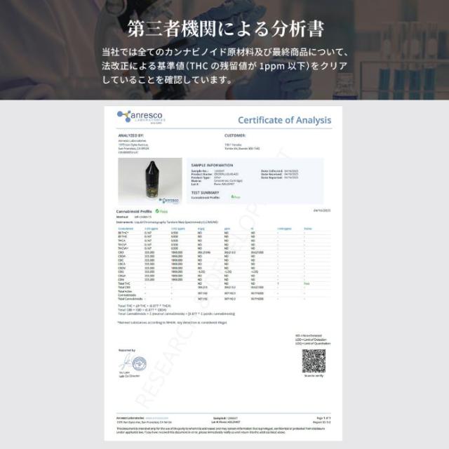 | 新基準適合 | 2024年12月12日施行された「大麻取締法及び麻薬及び向精神薬取締法の一部を改正する法律」により、CBD製品に含まれるTHCの残留値に新たな基準値が設けられました。現在、当社から販売しているすべてのカンナビノイド製品に関しましては、原材料の受け入れから最終製品の完成までに複数回の第三者機関による品質検査を実施しており、新基準値に適合していることを確認しております。これまで通り、高い品質の製品をお届けしてまいりますので、安心してご使用ください。 |