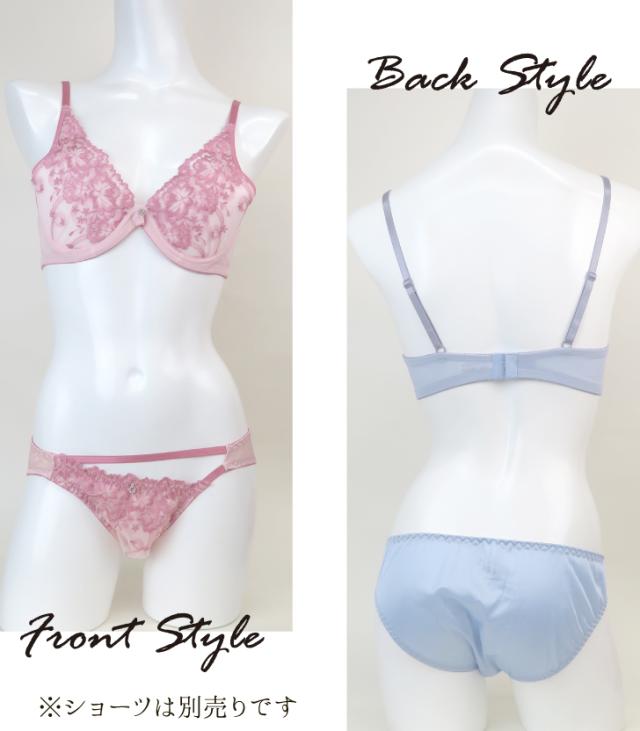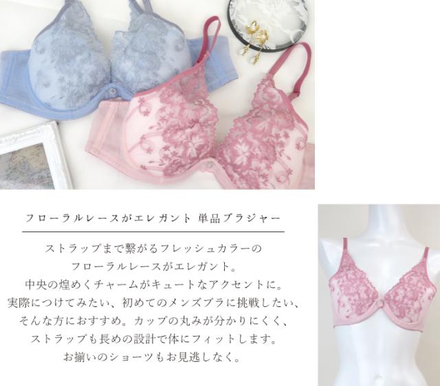 ストラップまで繋がるフレッシュカラーのフローラルレースがエレガント。中央の煌めくチャームがキュートなアクセントに。実際につけてみたい、初めてのメンズブラに挑戦したい、そんな方におすすめ。カップの丸みが分かりにくく、ストラップも長めの設計で体にフィットします。お揃いのショーツもお見逃しなく。