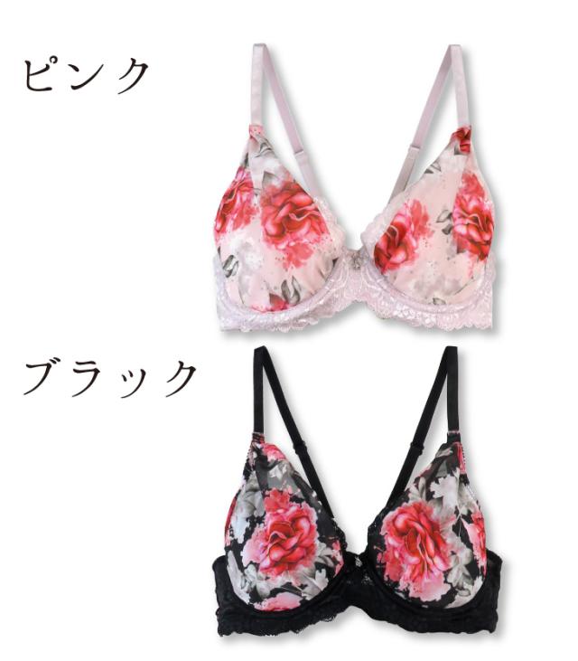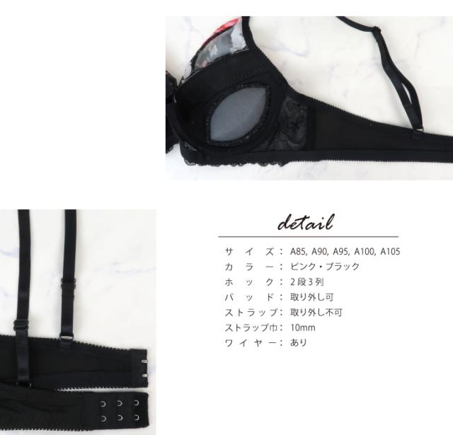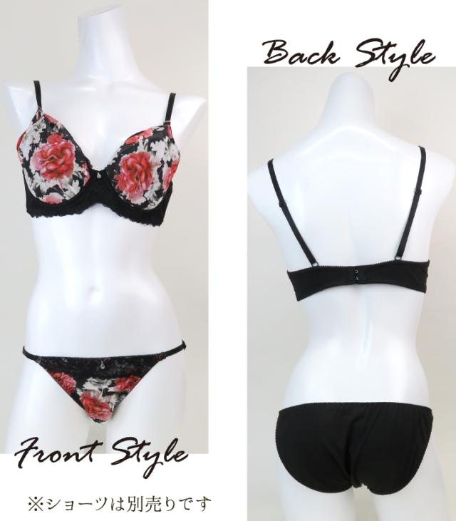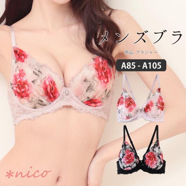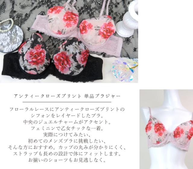 フローラルレースにアンティークローズプリントのシフォンをレイヤードしたブラ。中央のジュエルチャームがアクセント。フェミニンで乙女チックな一着。実際につけてみたい、初めてのメンズブラに挑戦したい、そんな方におすすめ。カップの丸みが分かりにくく、ストラップも長めの設計で体にフィットします。お揃いのショーツもお見逃しなく。