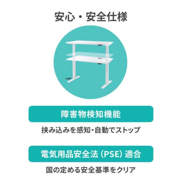 ●電動モーターにより天板位置を上下昇降させることができます。●天板位置は任意の位置で停止可能です。高さH700〜1150mmまで可動します。●昇降の際はスイッチボタンを押し続けることで動作します。危険を発見したり、すぐに停止させたいと思った場合にはボタンから手を放すことで動作が停止します。●コントローラーは現在の高さが一目で分かるインジケーターを搭載しています。また、高さを3ヶ所まで保存できるメモリー機能付きで、お好みの高さまでワンタッチで昇降可能です。●デスク下降時に障害物を検知し、挟み込みを防止する機能を搭載しています。障害物を感知すると瞬時に運転をやめ、自動的に位置を少し戻します。※この機能はデスク本体及び、対象物の破損を未然に防ぐものであり、人体への安全を考慮したものではありません。また全ての条件下において動作を保証するものではありません。●脚フレームを左右それぞれ100mmずつ内側へ取り付けることができます。両サイドにクランプタイプのモニタアームなどを取り付けることができるようになり、組み合わせてミーティングデスクのように使用することができます。●天板メラミンは白色を採用しており、オフィス全体を明るくします。●天板のホルムアルデヒド放散基準値はF☆☆☆☆で、ホルムアルデヒドの放出量を軽減しています。●天板にはケーブル口があります。●電気用品安全法(PSE)技術基準適合品です。