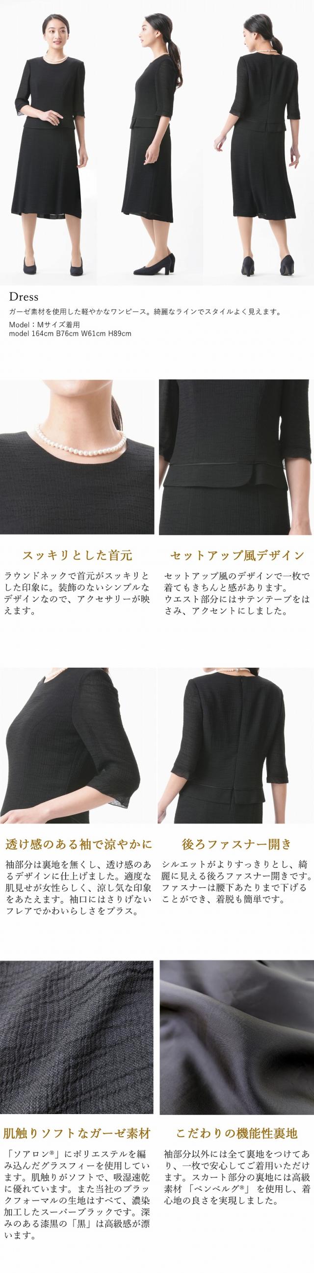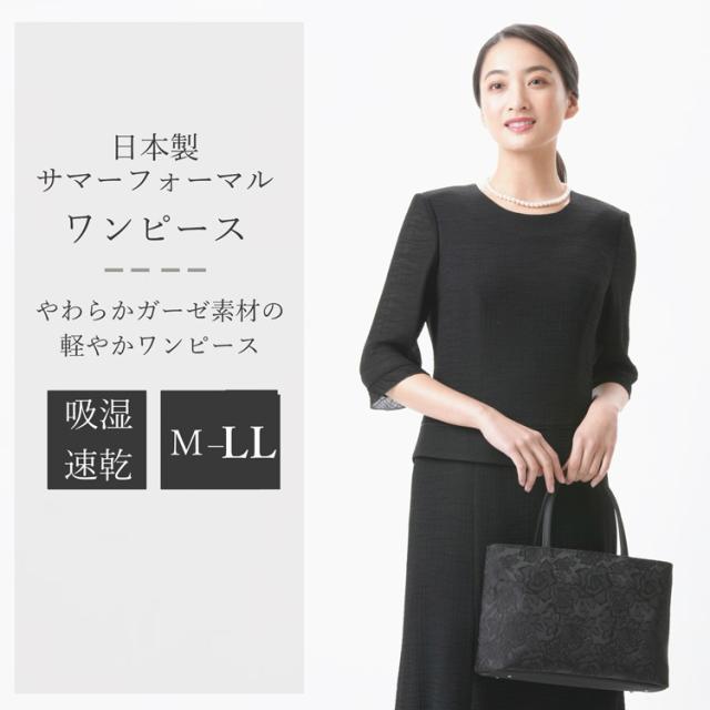 送料無料 日本製 夏用 ブラックフォーマル ワンピース:RL109630 セットアップ風 ガーゼ素材 M/L/LL 黒 冠婚葬祭 葬儀 葬式 通夜 法事 法要 礼装 サマーフォーマル 礼服 喪服 レディース 婦人