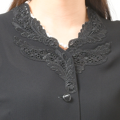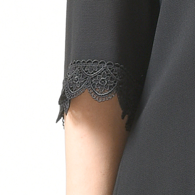 | 胸元のレースが華やかな印象です。シンプルなデザインでながくお使いいただけます。 |