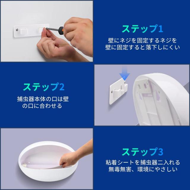害虫が好む光に集まる習性を利用して、ライトで誘導して、害虫が内側の虫取り粘着シート触れると瞬時に粘着されました。